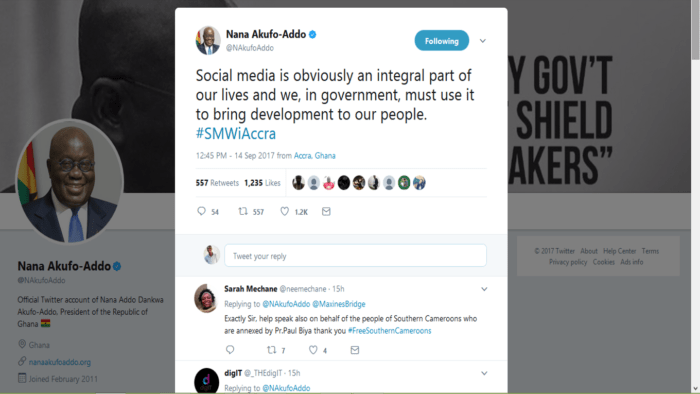 “Social media is obviously an intergral part of our lives. And we in government must use it to bring development to our people. #SMWiAccra”