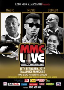 On Saturday, Global Media Alliance will host an exciting night of laughter and boundless excitement. The 2nd edition of their Music, Magic and Comedy (MMC) Live will be biiiiig. Destined to be a night of rib cracking moments, DKB, Khemikal, Lexis, and Jacinta, Kofi Kinaata will thrill fans.